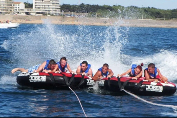 Un grand moment de détente. Sautez chacun dans votre bouée et partez en même temps derrière un puissant bateau de ski nautique, sensations garanties.Virages, accélérations, saut de vague, cramponnez-vous aux poignées ! Bonne humeur garantie !!!