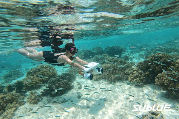 Grâce à son moteur, le scooter sous-marin vous permet de plonger à plusieurs mètres de profondeur, de vous déplacer plus rapidement et de faire des pirouettes à la surface et sous l’eau !